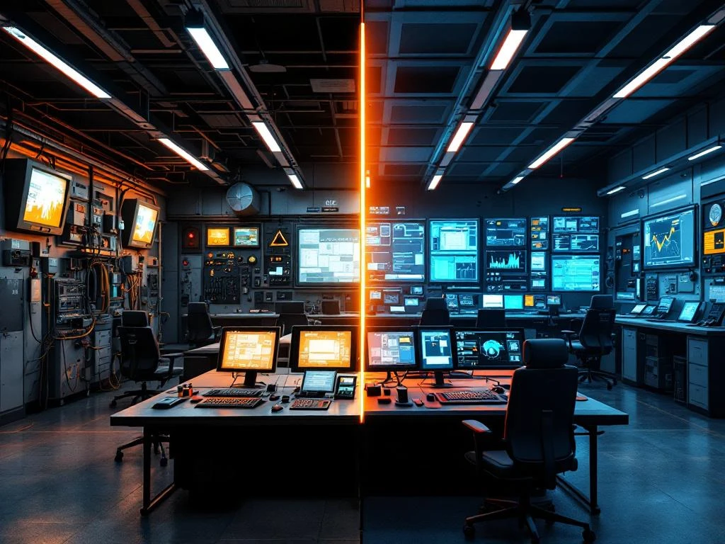 Futuristische controleruimte met holografische displays, AI-monitoren, communicatie-arrays en ergonomische werkstationsModerne noodcentrale met zeven verlichte werkstations, gebogen monitoren en ergonomische stoelen in professionele omgeving