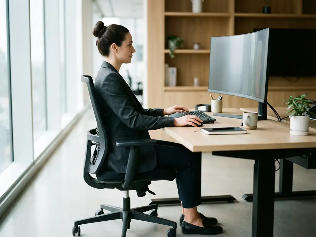 Een juiste zithouding bij ergonomisch werken houdt in dat je rechtop zit met je voeten plat op de grond, je onderrug ondersteund door de rugleuning, en je armen ontspannen naast je lichaam. Je beeldscherm staat op ooghoogte en je knieën bevinden zich in een hoek van ongeveer 90 graden. Deze houding voorkomt fysieke overbelasting en ondersteunt je natuurlijke lichaamshouding tijdens lange werkdagen.