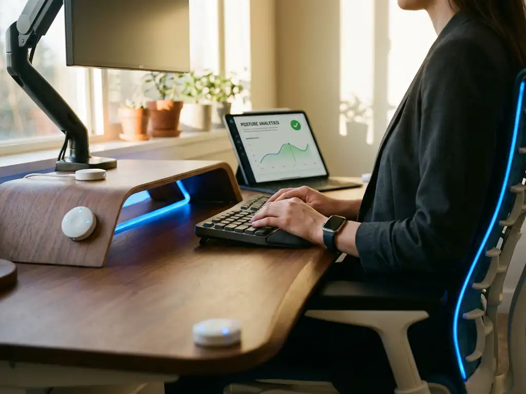 Houdingssensoren meten je lichaamspositie en detecteren wanneer je onderuitzakt of je nek verdraait. Bewegingsdetectoren registreren hoe vaak je opstaat en beweegt. Omgevingssensoren controleren temperatuur, luchtvochtigheid en lichtsterkte om optimale werkomstandigheden te garanderen.