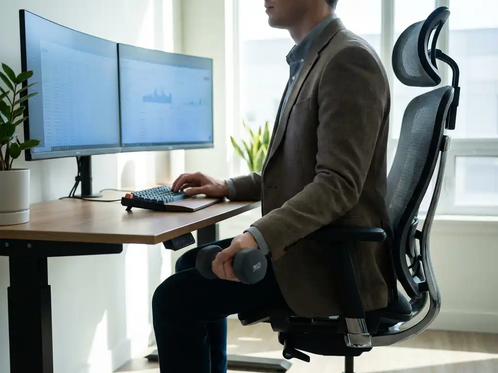 Een ergonomische stoel ondersteunt natuurlijke beweging. Kies een stoel met een dynamische zitting die kleine bewegingen toestaat, verstelbare armleggers en goede lendensteun. De stoel moet je uitnodigen tot kleine houdingsveranderingen in plaats van je vast te zetten.