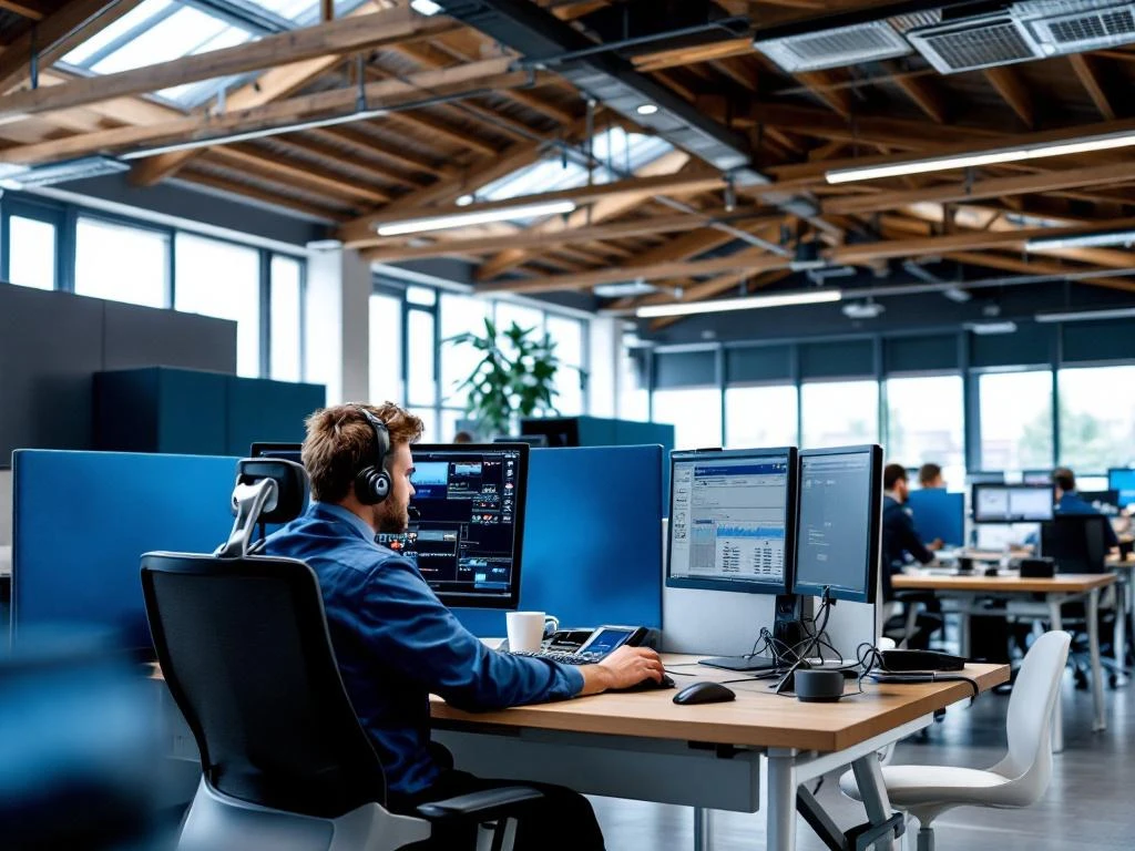 Nederlandse 112 meldkamer met operator aan bureau met drie monitoren, houten balken en blauwe werkplekscheidingenNederlandse 112-meldkamer met operator aan werkstation met drie monitoren en headset in moderne kantoorruimte