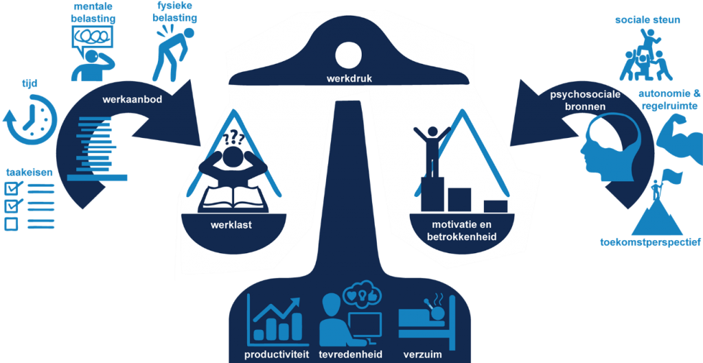 Werkdruk kun je zien als de balans tussen de hoeveelheid werk (de werklast) en de motivatie en betrokkenheid (onder invloed van sociale steun, autonomie en toekomstperspectief). Een hoge werklast hoeft daarmee niet te leiden tot te hoge werkdruk (en burn-out) als de motivatie en betrokkenheid maar voldoende hoog zijn. Veel van de factoren die van invloed zijn, kun je meten.